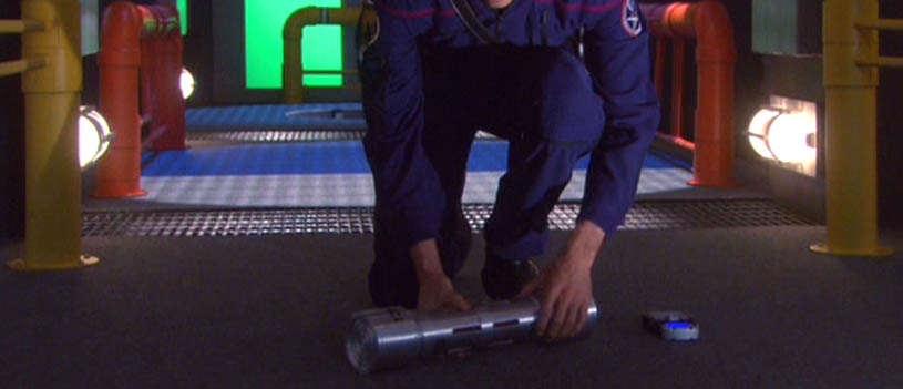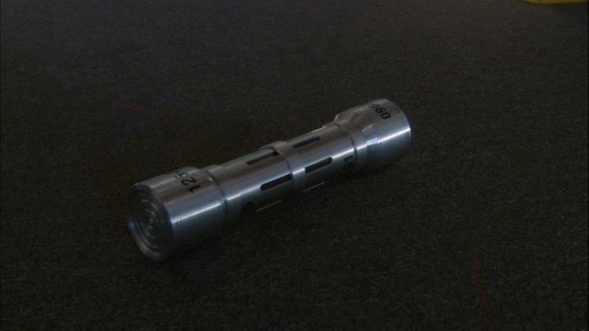 Description: Metal and glass cylinder used in various episodes including Star Trek: Enterprise “In a Mirror Darkly, Part II”. Stolen from Starship Defiant by a Gorn labor foreman to keep the ship from traveling at warp speed while the ship was trapped in the evil “Mirror Universe” under the control of the mirror versions of Captain Archer and the Enterprise crew. Measures approx. 18 X 4 inches.