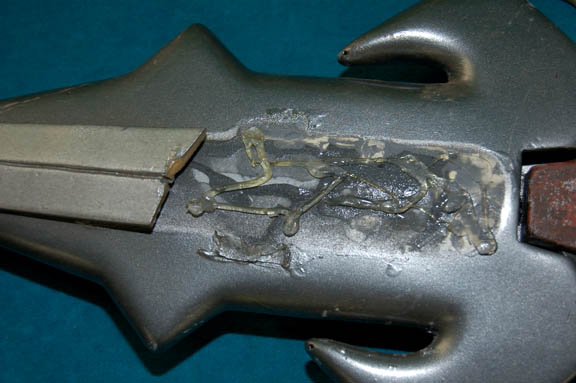 Description: A prop Klingon weapon featured in the Star Trek: Enterprise episode “The Augments”; wherein “Arik Soong” (Brent Spiner) and his band of augmented humans try to start a war with the Klingons. This weapon is the D'k Tahg, it is the traditional knife of the Klingon warrior and probably one of the most recognizable weapons in the Star Trek pantheon; it is a reinforced rubber knife with a single, straight primary blade and two little blades sticking out from the sides. The handle is black rubber with brownish-red accents, a design on the butt that represents an unnamed Klingon house; also included is a gray, molded-plastic sheath for the knife with a plastic accent that has halfway broken off, two hoops to attach it to a belt and a gray strap to tie it with. The knife has minor cracking in the surface of the rubber but the worst damage by far is the broken accent on the sheath. The item measures approx. 17 X 6 X 1.5 inches.