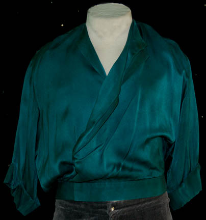 Description: A costume featured in the Star Trek: The Next Generation episode “Starship Mine”; wherein “Captain Picard” (Patrick Stewart) finds that a band of mercenaries have beamed onto an abandoned “Enterprise-D” to steal trilithium resin from the warp core. This costume is for wear by Patrick Stewart in the role of the Captain of the “Enterprise-D”, “Jean-Luc Picard”, and is a dark teal colored, silk riding shirt with an open front wrap, buttons and clasps down the front, and minor staining due to time and storage; also included are gray, corduroy, riding trousers with reinforced knee patches, and blue accents outlining the Velcro cuff adjustments.