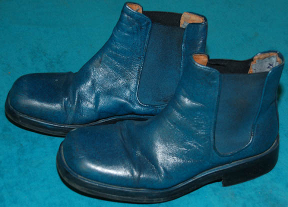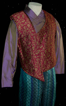 Description: A costume featured in the Star Trek: Voyager episode “Homestead”; wherein “Voyager” finds a settlement of Talaxians on an asteroid that is being besieged by an alien race that wants to mine the asteroid and “Neelix” (Ethan Philips) opts to stay with them. This costume is for wear by Ethan Philips in the role of the “Voyager” Morale Officer, “Neelix”, and is a long-sleeved, iridescent-purple shirt with a pattern of gray squares, wrap around flap that buttons down the front, a reddish-purple, asymmetrical front, vest featuring a tan floral pattern, a long-sleeved, asymmetrical front, jacket in vertical stripes of multiple, metallic blue and green, diagonal textured accents, a Velcro patch for a commbadge (not included), buttons down the front, corresponding trousers, and blue, leather shoes. A sewn in tag reads ‘Voyager, Ethan Philips'.
