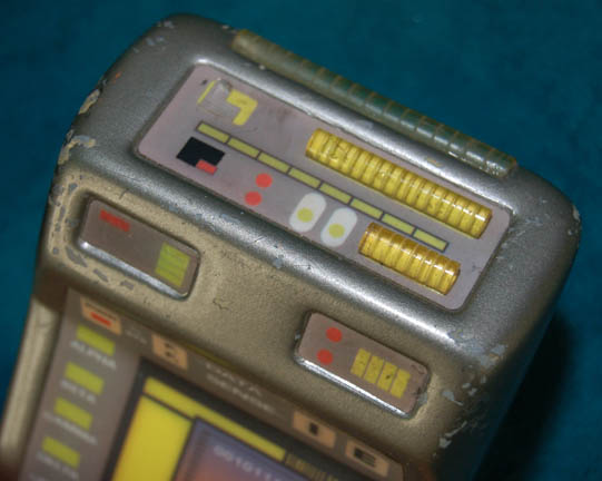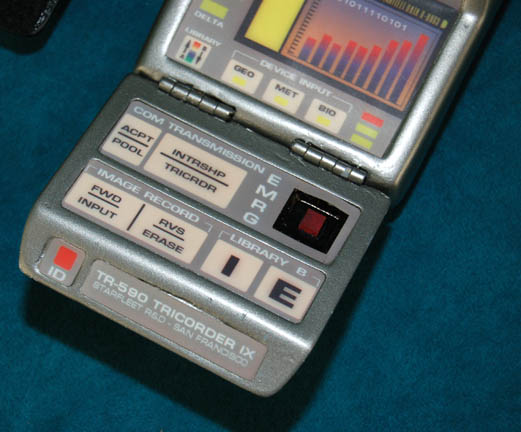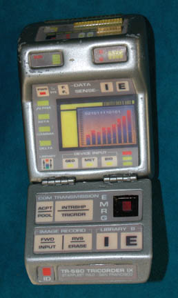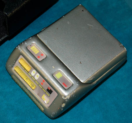 Description: A prop item featured in various episodes of Star Trek: Voyager. This item is the TR-590 Mark IX Tricorder upgrade and is a resin cast, elongated trapezoid that unfolds to reveal appliqué, color-printed control surfaces, more appliqué control surfaces and yellow plastic accents on the top end, and a vacuum formed black plastic holster with latches for the belt. The item measures approx. 4 X 3.5 X 2 inches.
