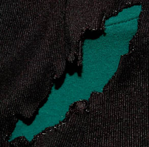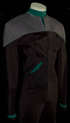 Description: A distressed Starfleet uniform jumpsuit featured in Star Trek: Deep Space Nine for wear by Terry Farrel in her portrayal of “Jadzia Dax”. The costume is a black form fitting jumpsuit with grey quilted shoulders and sciences blue division trim on the cuffs, with a blue sleeveless undershirt. The costume is distressed in that a sizeable tear is present in the right front waist above the belt line. The sewn in Deep Space Nine tags read ‘Terry Farrel' and ‘Dax Farrel’ while the costumer’s tag reads ‘DS9 Dax, Jadzia, Terry Farrel, Seasons 5-6’.