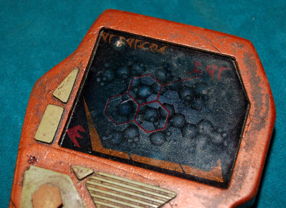 Description: A prop item featured in various episode of Star Trek: Enterprise that involved the Klingons. This item is a PADD, Personal Access Display Device, a handheld interface for computers that can be taken where ever needed and is an asymmetrically, angular shaped, reddish-brown, and rubber cast with yellowish-green, textured accents, gold-colored buttons at the bottom, a set of light-brown hexagonal buttons along the left hand side and a black appliqué “screen” featuring some sort of molecular formula and Klingon script on it. The Item measures 6 X 3.5 X 1 inches.