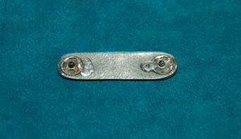 Description: A metal provisional rank pin made for ‘Maquis' crewmembers who integrated into the Starfleet crew of “USS Voyager” following their displacement into the Delta Quadrant during the pilot episode of Star Trek: Voyager, “Caretaker”. This pin indicates the provisional rank of ‘crewman’ due to its molded single stripe and the blackened coloration of that stripe. A slightly curved metal pin with inset painted a shade of gold, and with black highlights around the inner edge, this style of pin showed up in various episodes of the series seven year run. The item features a pair of snaps on the back ready to be attached to receiving snaps on the yoke of a gray turtleneck undershirt corresponding to those worn by characters in the series. Due to the frequency of appearances of ‘crewman’ rank characters in the series a number of these will be available in the auction. The hue of coloration regarding the stripe, highlights, and inset may vary from the photograph. None of the available items have been in any way altered upon their location.