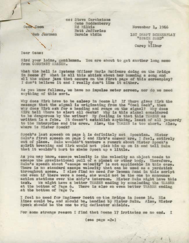 Description: (NBC-TV, 1966-69) A remarkable collection of 17 original carbon-copy memos from associate producer, Bob Justman, to executive producer, Gene Roddenberry, and writer, Gene Coon. 42 pages total, varying from 1 to 6 pages in length. The memos span November 1, 1966 through September 5, 1967 and include the episodes: “Space Seed”, “The Devil in the Dark”, “Operation – Destroy”, “Errand of Mercy”, “The Planet Eater” (a.k.a. “The Doomsday Machine”, “Catspaw”, “Amok Time”, “The Apple”, “Wolf in the Pond”, “I, Mudd”, “Who Mourns for Adonais”, “The Changeling” (two memos), “Journey to Babel”, “Whom Gods Destroy” (a.k.a. “Operation Annihilate!”), “Bread & Circuses”, and “Joanna.” (a.k.a. “The Way to Eden.” <p>Accompanying the lot is Gene Roddenberry’s honorary certificate of membership in The Explorers Club presented to him on March 12, 1968.