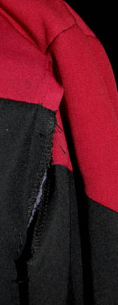 Description: A costume similar to those featured in various episodes of Star Trek: Voyager for wear by Robert Beltran in the role of the Maquis leader turned Starfleet officer, “Commander Chakotay”, and is the standard, Type-B, Starfleet uniform jumpsuit in Command Red, a zip down the front, a Velcro patch for a commbadge (not included), hoops for tools along the waist, stirrups for the feet, a gray, long-sleeved, undershirt with unattached rank pips and a zip up the back. The costume has a small tear along the back of the neck and the seam along the left shoulder has started to tear out and is attached with a safety pin. A sewn in tag reads ‘Voyager, Robert Beltran'.