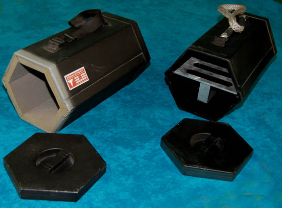 Description: A pair of hexagonal plastic prop containers featured in various Star Trek: Enterprise episodes as part of “Dr. Phlox's” (John Billingsley) sickbay on the “Enterprise NX-01”. They both feature hexagonal lids that remove to reveal interiors, one being padded with multiple nicks in the foam from set use, and the other with a slide out tray made from silver colored metal featuring multiple cut out slots for non-present items. They both feature shoulder straps, one of black nylon, the other of rope. The one with the padded interior and nylon shoulder strap also features a pair of Starfleet inventory applications colored red with a white cadesus reading ‘Surgical supplies 47-5’. The items measure approx. 18.5 X 10 X 10 X 10 inches.