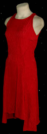 Description: A costume featured in the Star Trek: Deep Space Nine episode “You Are Cordially Invited…”; wherein “General Martok's” (J. G. Hertzler) wife comes aboard Deep Space Nine test the worthiness of “Lt. Commander Dax” (Terry Farrell) to join the “House of Martok”. This costume is for wear by Nana Visitor in the role of the Bajoran liaison officer to the Federation on Deep Space Nine, “Major Kira Nerys” and is a sleeveless, knee-length, red dress featuring a textured design of falling leaves, a sewn on mini-train on the back and a zip up the side. The costumer’s tag reads ‘DS9 #531, Kira, Nana Visitor’.