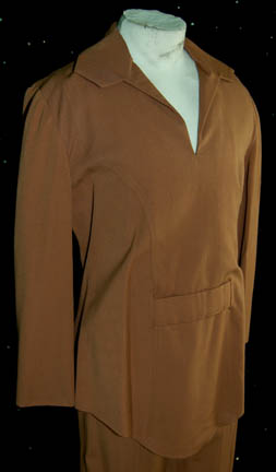 Description: A collared brown Class-A Starfleet uniform featured in Star Trek I: The Motion Picture. The costume is brown trousers with a matching long sleeved shirt weighted at the hem of the waist to maintain sharp lines and an appearance absent of wrinkles. The costume also comes with these unattached accessories: a plastic bio-monitor, a green backed Starfleet emblem patch for the left breast indicating the wearer to be part of the medical division, and two rank-division strips with gold thread triangles indicating the wearer to be a ‘petty officer' (despite the fact that Class-A uniforms appeared only with rank braids on the sleeves which are absent of this lot). The costume is intended for male wearers.