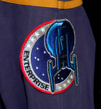 Description: A female Starfleet jumpsuit with Command gold trim around the shoulders made for use during the Star Trek: Enterprise series. It has a famous NX-01 Enterprise patch on the left sleeve, a zip up the front and multiple zippered pockets. There are zips and adjustable Velcro fasteners at the cuffs and ankles. Worn under the jumpsuit is a sleevless black shirt with buttons up the front. Costume comes complete with costume tag.