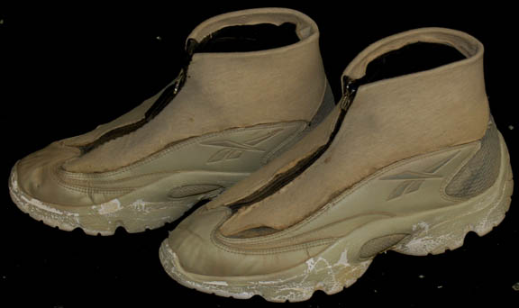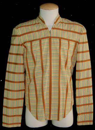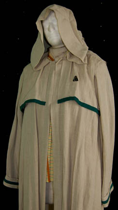 Description: A costume featured in the Star Trek: Deep Space Nine episode “Shadows and Symbols”; wherein “Captain Sisko” (Avery Brooks) searches for the Orb of the Emissary and “Major Kira” (Nana Visitor) confronts Romulan “Senator Cretak” (Megan Cole) about the true purpose of their “hospital” on the Bajoran moon. This costume is for wear by Cirroc Lofton in the role of the aspiring journalist and son to “Captain Sisko”, “Jake Sisko”, and consists of a 24th century, Starfleet desert uniform robe; a long-sleeved, off-white bolero robe with Science Blue division strips across the chest and on the cuffs, a Velcro patch for a commbadge (not included) with the adhesive from the production commbadge used still stuck to it, an attached hood, mesh fabric along the insides of the shoulders, a long-sleeved, yellow shirt featuring wide rust-colored stripes and other thin, multi-colored stripes, a pair of Reebok basketball shoes with a neoprene cover of a matching color to the robe, sewn onto the top to keep sand out of them. A sewn in tag reads ‘Deep Space Nine, Cirroc Lofton' and the costumer’s tag reads ‘552 Shadows and Symbols, Jake, Cirroc Lofton’.