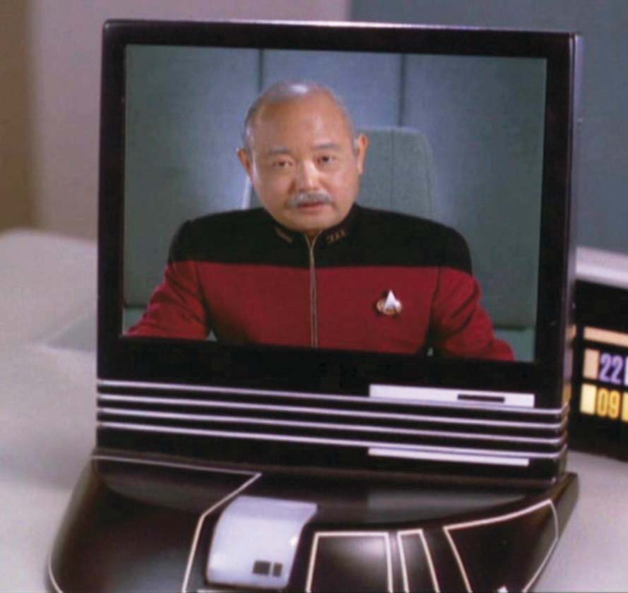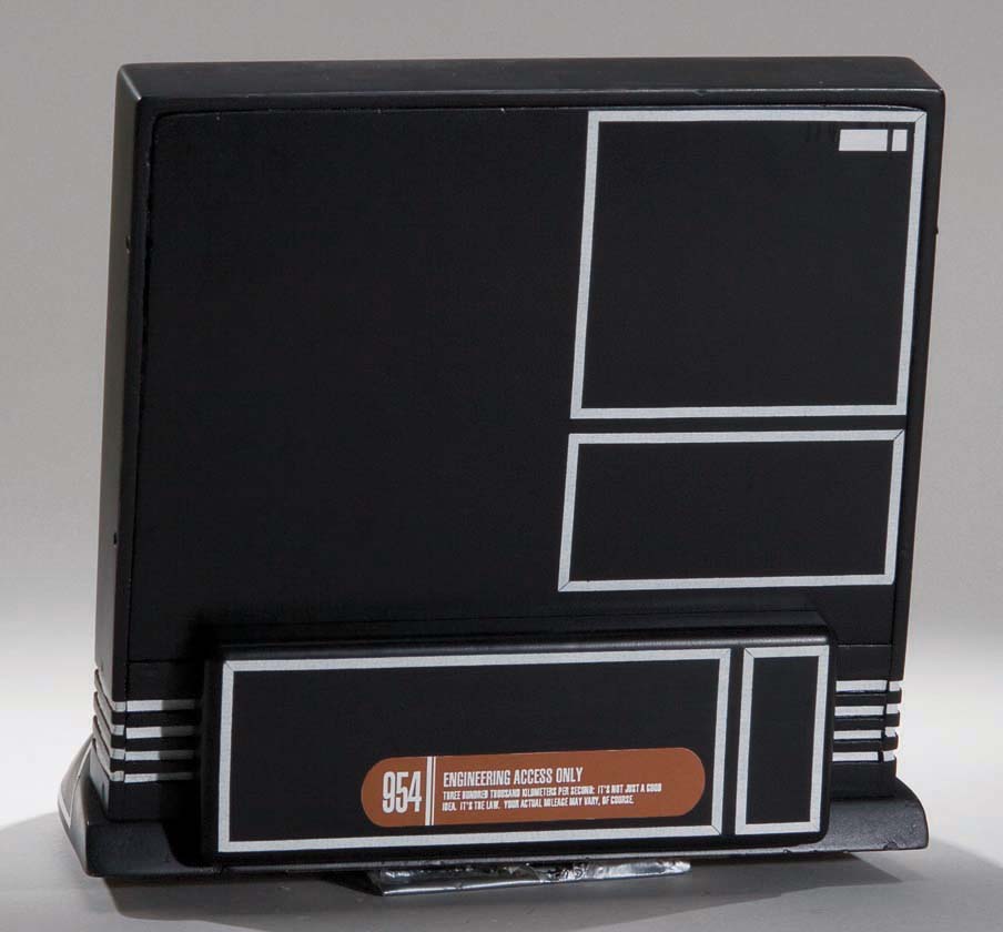 Description: (Paramount-TV, 1987) Hero working prop used in all seven seasons of <i>Star Trek: The Next Generation</i> as well as the seventh Star Trek film, <i>Generations</i>. The surface and lighted graphics were refurbished at various points during the course of the series and the computer remains in its final configuration for <i>Star Trek: Generations</i>. The computer is marked "#1" on the bottom denoting its use as the primary hero computer. This particular computer made appearances in each of Picard's, Data's and Riker's quarters, Crusher's office and most notably in Captain Picard's Ready Room. Powered by AA batteries, depressing the main white switch engages the internal illumination for the screen. One of only two surviving illuminating Starfleet desktop computers from ST: TNG. An extremely rare and desirable prop.