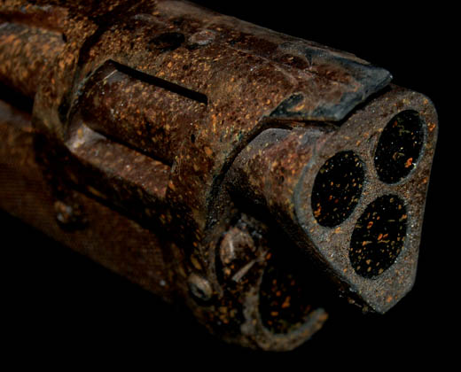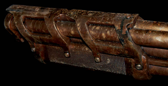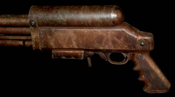 Description: A prop weapon featured in the Star Trek: Enterprise episode “Canamar”; wherein “Captain Archer” (Scott Bakula) and “Commander Tucker” (Connor Trinneer) are mistakenly arrested and incarcerated in the infamous “Canamar” prison. This prop item is a rubber cast rifle vaguely in the shape of a sawed-off shotgun, a copper/rust color, featuring a pistol handle, molded “metal” accents, and is distressed for effect. The item measures approx. 25 X 8 X 2 inches.