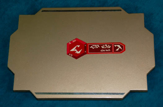 Description: Featured in Star Trek IX: Insurrection his high quality cast resin hand prop has been painted metallic gold with a raised black ‘screen' and silver tape accents. The image on the ‘screen’ is that of a spatial scan of the ‘Briar Patch’ and ‘Son’a’ character letters. On the reverse is a red application featuring similar ‘Son’a’ character letters. Item measures approx. 9 X 6 X .5 inches.