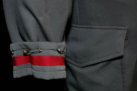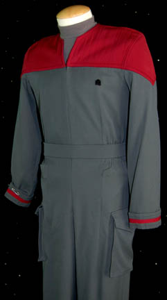 Description: A costume featured in the Star Trek: Deep Space Nine episode “Valiant”; wherein “Jake Sisko” (Cirroc Lofton) and “Nog” (Aron Eisenberg) encounter a Defiant class ship manned entirely by the elite Starfleet Red Squad cadets. This costume is for wear by Paul Popowich in the role of the "captain" of the "Valiant", "Cadet Watters", and is the standard Starfleet cadet uniform that began use around 2372; a gray jumpsuit featuring Command Red division strip, and strip around the cuff, Velcro patch for a commbadge (not included), hoops at the waist for tools, functioning pockets along the legs, a matching belt, stirrups for the feet, and a long-sleeved, gray undershirt with the Red Squad pin on the left side. A sewn in tag reads Deep Space Nine, Paul Popowich'.