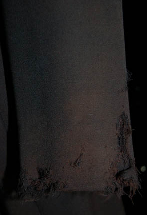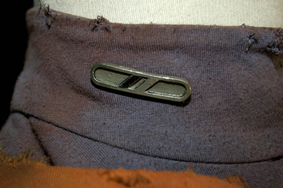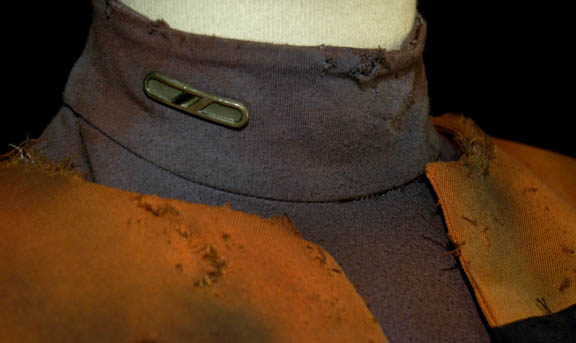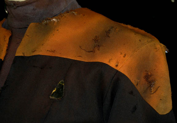 Description: A costume similar to those featured in various episodes of Star Trek: Voyager but this particular uniform is distressed to emulate “battle damage” or some damage sustained during any number of attacks that “Voyager” was pummeled with during it's time in the Delta Quadrant. This costume is for wear by Roxann Dawson in the role of the half-Klingon Chief of Engineering of “Voyager”, “B’Elanna Torres”, and is the standard, Type-B, Starfleet uniform jumpsuit in Operations Gold, a zip down the front, a Velcro patch for a commbadge (not included) that has been melted, hoops for tools along the waist, stirrups for the feet, a gray, long-sleeved, undershirt with unattached rank pips, and have both been distressed and features various burns, tears, and rips for effect. A sewn in tag on both read ‘Voyager, Roxann Dawson’.