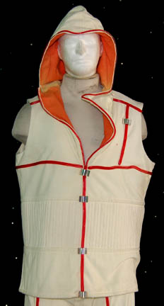 Description: An extremely soft cream colored sickbay patient costume featured in Star Trek I: The Motion Picture. The costume is trousers and a matching sleeveless shirt with a hood that features an orange interior lining. Both costume pieces feature red plastic tubing affixed by way of silver colored foil attachments. This fine representation is intended for male wearers.