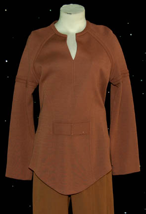 Description: A brown Class-B Starfleet uniform featured in Star Trek I: The Motion Picture. The costume is brown colored trousers with a long sleeved uniform shirt, the sleeves feature piping around the biceps, and a v-neck, and a pair of unattached shoes. The costume comes with an unattached plastic bio-monitor and a pair of white command division strips. The costume is intended for male wearers and features a sewn in Western Costume Co. tag reading ‘John D. Gowers'.