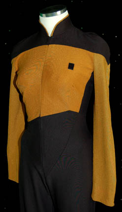 Description: A Star Trek: The Next Generation female Operations gold Starfleet uniform made for wear during the series and/or ‘The Next Generation' movies. The jumpsuit is black with Operations gold sleeves and upper torso. There is gold trim around the collar, a small Velcro patch on the left breast for a Combadge (not included) to attach and a zip up the front. Costume comes with costume tag.