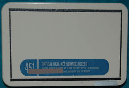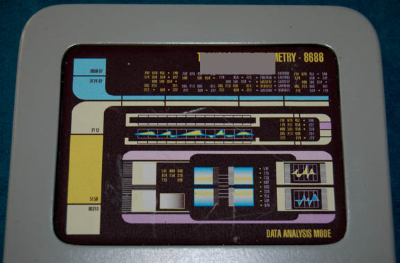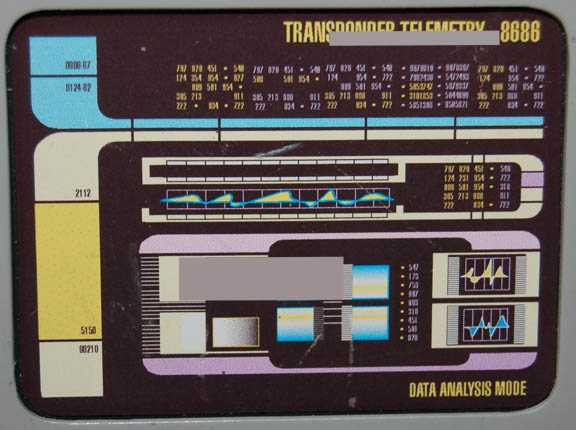 Description: A prop item similar to those featured frequently in 24th century Star Trek episodic television. This item is a P.A.D. D. (Personal Access Display Device) for use as a portable computer access display and is gray plastic, rounded, rectangle featuring an LCARS (Library Computer Access Retrieval System) style interface with a black appliqué of a “Transponder Telemetry” report, a silver accent “button” and several other access “buttons” along the bottom end and has a Starfleet Inventory sticker on the bottom that reads “451 OPTICAL DATA NET SERVICE ACCESS, Caution: Objects in mirror are closer than they appear. Do not remove under penalty of law. In space, no one can hear you scream.” This item measures approx. 6 X 4 X 0.5 inches.