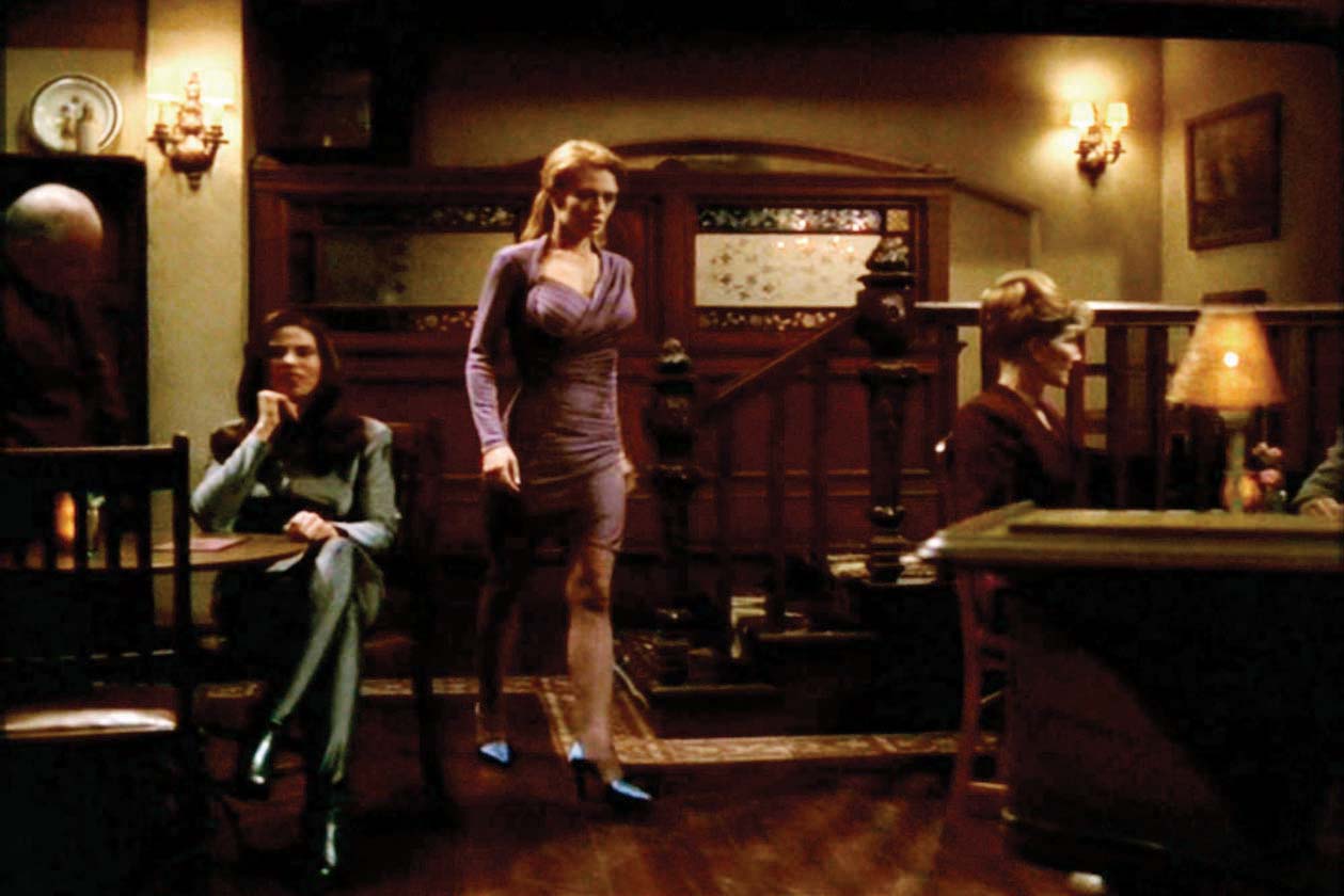 Description: (Paramount-TV, 1995-2001) <i>Star Trek: Voyager</i> “Seven of Nine” dress seen in episode “Someone to Watch Over Me”. This was used in one of the very rare occasions when “Seven of Nine” wears a dress on the series. The main plot is about “The Doctor” and “Seven of Nine”, a hologram and an ex-Borg learning to deal with romance. The plot owes much to modern retellings of the Pygmalion myth. Comprises a mauve spandex long-sleeved dress complete with color matching pantyhose.