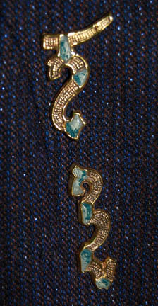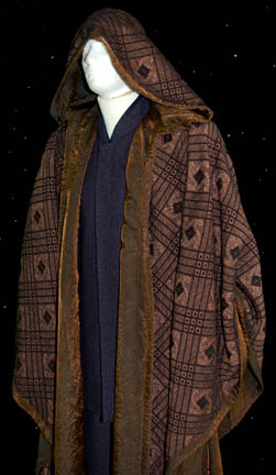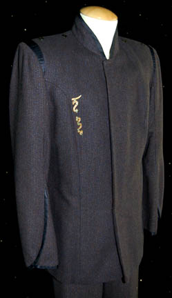 Description: The Vulcans are a humanoid race from the plant Vulcan who are known for their great sense of logic and stoic nature. They were one of the instrumental species responsible for establishing the United Federation of Planets. This is a Vulcan casual costume from the Star Trek: Enterprise series. The lined blue jacket has silver colored flecks in it, a zip up the front and snaps on the shoulders for a robe to attach. On the right breast are two beautiful metal Vulcan jewelry pins, each gold in color with blue and gray detail. The corresponding trousers are also blue with silver flecks. The robe is brown with a black geometric design, bell sleeves and a hood. Costume comes complete with costume tag.