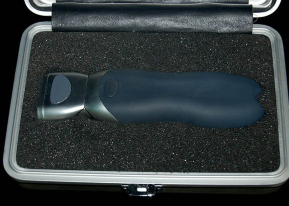 Description: This Starfleet medical case was used during the filming of Star Trek: Enterprise and was most likely featured in Dr. Phlox's sickbay onboard the U.S.S. Enterprise NX-01. Made of metal the case opens with a clasp on the side to reveal custom formed foam holding a medical scanner. The scanner is made of metal with a pivoted head and rubber formed handle. There are two LED lights on the front. The scanner is powered by four 910A 1.5 volt batteries (not included) however the original batteries (now removed) leaked and the connection points need to be cleaned. At the time of photography the scanner worked however due to the battery situation, there is no guarantee at this time. The case measures approx. 9 x 6 x 2 ½ inches.