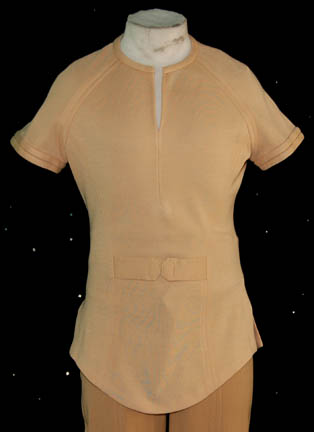 Description: A khaki colored Class-B Starfleet uniform featured in Star Trek I: The Motion Picture. The costume is khaki trousers and a tan short sleeved shirt with an unattached plastic bio-monitor and a pair of red division strips for the shoulders indicating the wearer to be a member of the engineering division.