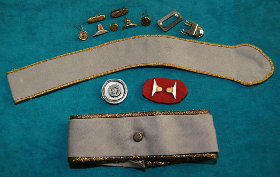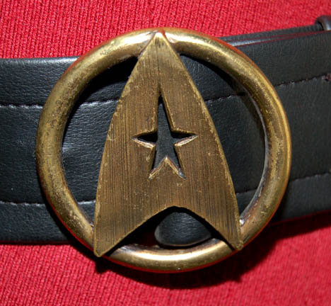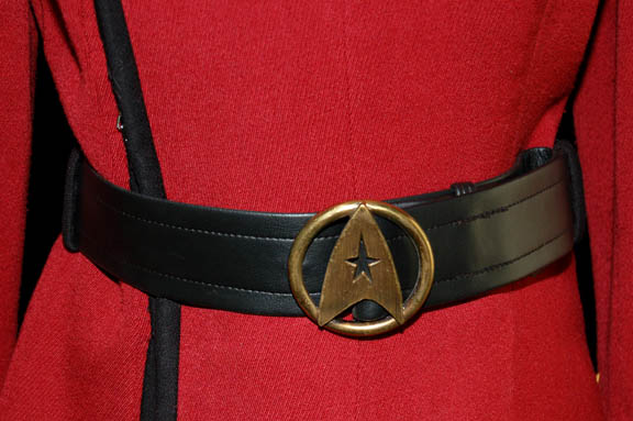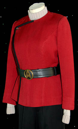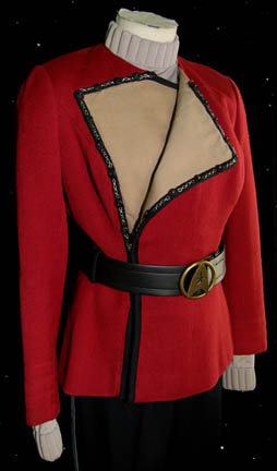 Description: A Starfleet officer's uniform for wear by Grace Lee Whitney in her portrayal of “Janice Rand” configured for representation of her rank in Star Trek VI: The Undiscovered Country. The costume is black uniform trousers with gray division stripes down the outside seams of the legs, a gray long sleeved undershirt with a ribbed collar and cuffs, and a red uniform jacket with black piping separating the double breasted fold over held on with snaps separated by silver colored metal chain accent. The uniform comes with these unattached elements: an unfinished gray operations division shoulder strip with gold trim, an unattached ‘security device’, a gray division strip for the left sleeve forearm with an affixed gild colored metal ‘5 year service’ pin, a red placement with two attached gold and silver colored metal badges making up the rank of ‘lieutenant (junior grade), a pair of gold colored metal commendation bars, a gild colored metal ‘5 year service’ pin, pair of gild colored metal ‘10 year service’ pins with molded Starfleet emblems, a pair of gold and silver colored metal badges making up the rank of ‘lieutenant (junior grade) for the shoulder strap, a metal opening for the shoulder strap twist clasp, a black leather belt with a gold colored metal Starfleet emblem buckle, and four costumer’s tags reading ‘Star Trek VI, Grace Lee Whitney as Excelsior Comm. Officer’. The belt features an interior label inscribed ‘Grace Lee Whitney’, the shirt is itself inscribed ‘Grace Whitney’, and the trousers feature a sewn in Paramount tag reading ‘Grace Whitney’.