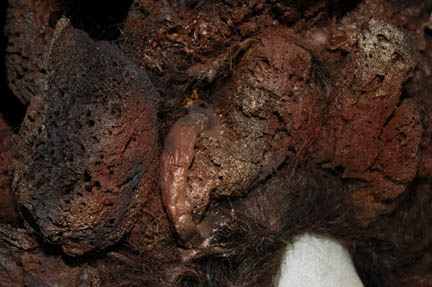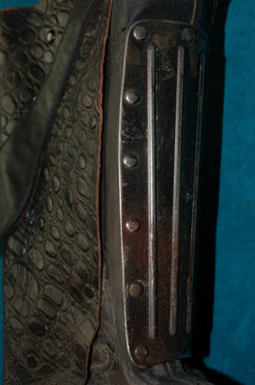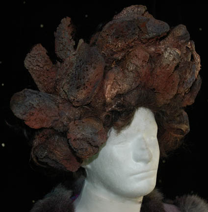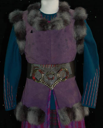 Description: A costume featured in Star Trek: Voyager second season finale episode “Basics: Part I”; wherein “Voyager” is taken by the Kazon-Nistrim in a sneak attack, the crew is left on a primitive planet to die, and “Tom Paris” (Robert Duncan McNiell) is believed dead. This costume is for wear by John Gegenhuber in the role of the Kazon that sabotages and cripples “Voyager” with a suicide bomb, “Tierna”, and is a sleeveless, multi-colored, vertically striped, tunic, a long-sleeved, teal, shirt featuring vertical stripes radiating from the collar and along the cuffs, what seem like magenta plaid trousers, and a purple, fur-lined vest, a rubber sash with metal and leather accents; brown leather, tall boots with metal plates along the front, and a wig of the Kazon style. A sewn in tag reads ‘Voyager, John Gegenhuber' and the costumer’s tag reads ‘Voyager 142 Basics, Tierna, John Gegenhuber’.