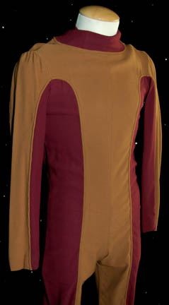 Description: A costume featured in various episodes of Deep Space Nine. This costume is a full-length, long-sleeved tan jumpsuit featuring magenta-colored accents along the inside of the sleeves, down the ribs and outer part of the legs; a zip up the back and stirrups for the feet. The costumer's tag reads ‘DS9, Bajoran Waiter’.