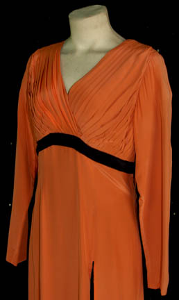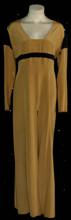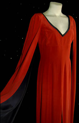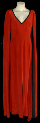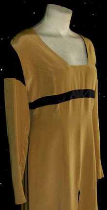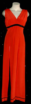 Description: A costume lot featured in the Star Trek: Voyager episode “Favorite Son”; wherein “Ensign Kim” (Garrett Wang) finds that he seems to be a member of a Delta Quadrant race who doesn't want him to leave the planet again. Inlcuded in this lot are costumes for wear by Deborah May as “Lyris”, Kellie Kirkland as “Rinna” and Ellen Alexander all as Taresians that are attempting to make “Ensign Kim” want to stay with them believe he is one of them; they are a long-sleeved, red-orange dress featuring extremely long, open sleeves, black accents around the collar; a bright red, sleeveless dress featuring pleating around the bust line, and a v-neck collar; an orange/peach, long-sleeved dress featuring numerous pleats across the chest, empire waist, and v-neck collar. A long-sleeved, gold-colored dress with the same empire waist but with the black accents around the shoulders and a squared-off collar; also included is an orange sleeveless version of the long-sleeved orange/peach dress and a pair for high-heeled shoes. All dresses have black lining and either one or two slits up the front. Sewn in tags denote wear by Ellen Alexander, Kelli Kirkland, Deborah May, and veteran Trek stunt person Pat Tallman as do the collective costumer’s tags.