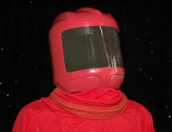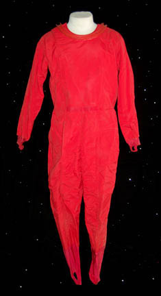 Description: This costume was seen during the opening scenes of the Star Trek feature film “Insurrection” and is a Starfleet Federation “Isolation suit” used by Starfleet to make the wearer practically invisible while conducting an anthropological survey of the Ba'Ku. Characters who wore this style of costume include “Data” (Brent Spiner” and stunt performers. The first item is a red jumpsuit worn by stuntman “Warren A. Stevens” that has a rubber neckline, a Velcro waist for the rubber belt to attach and stirrups at the feet and thumbs to hold the fabric taut. The suit comes with a red plastic helmet, red rubber boots that has slight dirt and distress to the back of one of them and a pair of red gloves. An additional red jumpsuit also worn by Stevens is included.