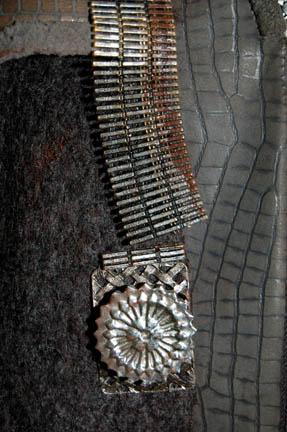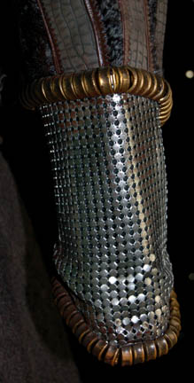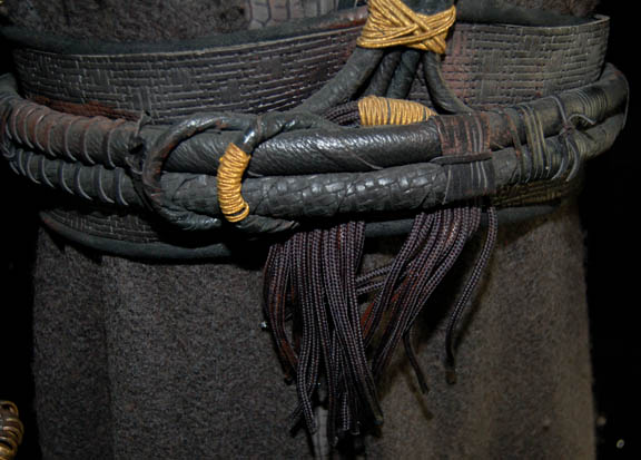 Description: “Orak” (John Vickery) was a Klingon advocate featured in the Star Trek: Enterprise episode “Judgement” in which he prosecuted “Captain Archer” (Scott Bakula) during his trial on Narendra III. The costume includes a black sleeveless shirt with chain-mail neckline spray painted brown. The coat is gray patterned leather with faux fur sections on the sleeves and chain-mail cuffs. Gold colored metal links are added for detail above and below the chain-mail cuffs. A sleeveless woolen robe with leather collar and metal accents is worn over the jacket. Also included is an impressive black leather harness with woven leather detail, metal rivets and gold thread. Costume comes complete with costume tag.