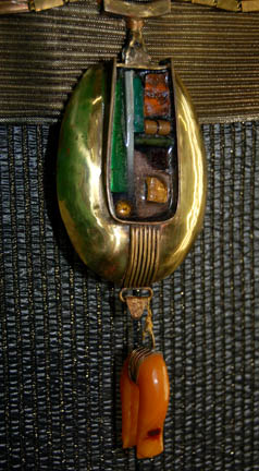 Description: A costume featured in the Star Trek: The Next Generation episode “Cost of Living”; wherein “Lwaxana Troi” (Majel Barrett) comes aboard the “Enterprise-D” once again engaged, wanting to have the wedding on the ship, and suddenly taking an interest in “Alexander” (Brian Bonsall). This costume is for wear by Tony Jay in the role of “Lwaxana's” newest prospective husband and third minister to the Conference of Judge on Kostolain, “Campio” and is a long-sleeved, full-length, metallic gray robe featuring vertical, gold stripes, a reflective gold and black diamond pattern along the shoulders, collar, sleeves, and down the sides; a dickie of the same diamond pattern, a gold-colored, striped, horizontal sash featuring further gold-colored “jeweled” accents with metal link and round hooped accents on either side, and a molded skull cap in the same striped and diamond pattern as the jacket. The costumer’s tag reads ‘TNG 210 Cost of Living, Campio, Tony Jay’.