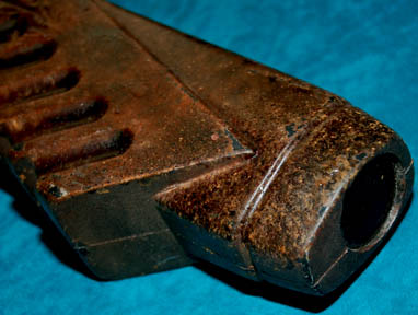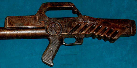 Description: A prop weapon featured in the Star Trek: Enterprise episode “Anomaly”; wherein the “Enterprise NX-01” encounters dangerous anomalies and through the serious damage sustained by them, is helpless before a boarding party of pirates called Osaarians. This item is roughly the shape of a more conventional rifle, made of rust-colored, molded rubber, with an attached stock, textured accents below the barrel, and is distressed for effect. The item measures approx. 17 X 9 X 1 inches.
