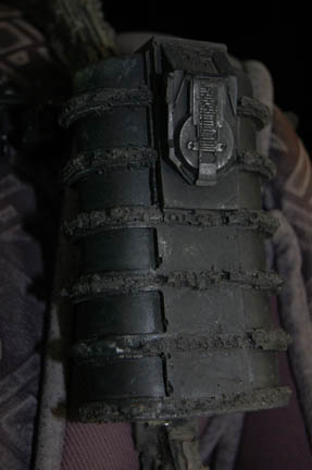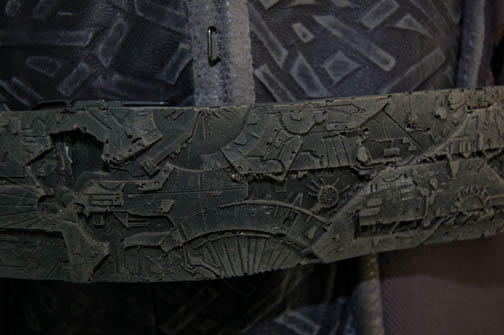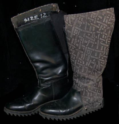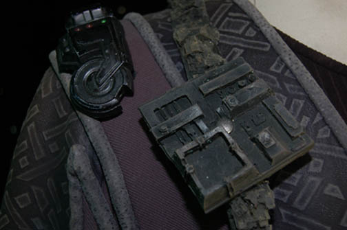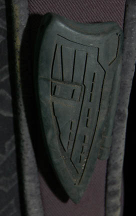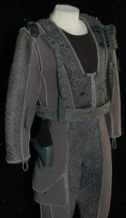 Description: A costume lot featured in various episodes of Star Trek: Deep Space Nine for wear by actors portraying Jem'Hadar. The costume is composed of neoprene overalls with stamped in pattern and a functional flap topped pocket, a uniform jacket top with multiple Velcro placements for corresponding molded resin and rubber accents, a pair of matching boots (size 12), a neoprene vest, and a molded rubber belt and harness built on a black nylon belt. Multiple sewn in show tags indicate use by multiple actors.