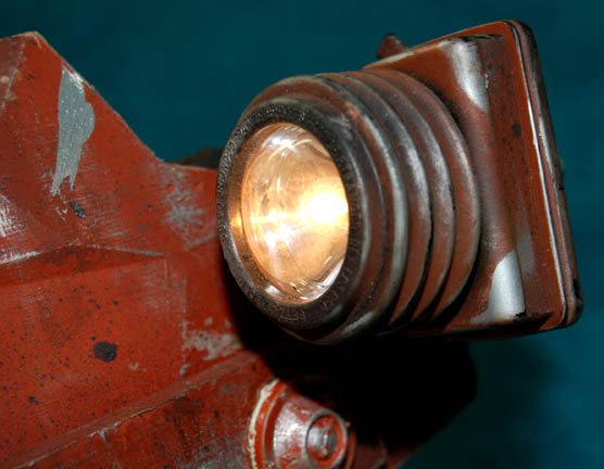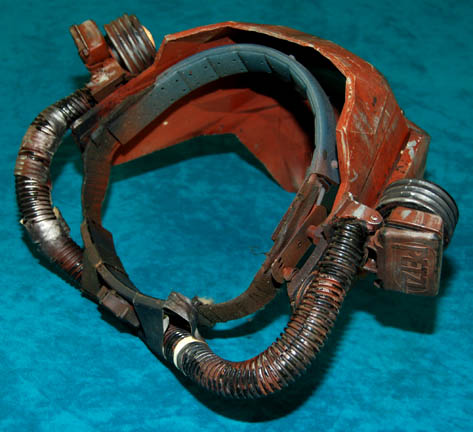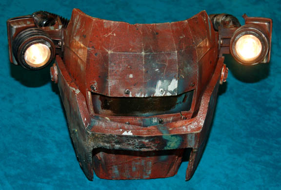 Description: A prop face mask with working head lamps featured in Star Trek VI: The Undiscovered Country in scenes taking place at Rura Penthe. The item is high quality molded plastic with a clear eye slit and a pivoting front piece. The side mounted head lamps are powered by two AA sized 1.5volt batteries each and twist on to operate. Colored rust red the item is distressed to appear burned and used. With a size adjustable band this item measures approx. 14 X 11 X 9.25 inches.