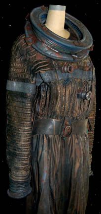 Description: The Malon are a humanoid species from Malon Prime who were encountered by the U.S.S. Voyager in the Star Trek: Voyager episode “Juggernaut” in which a Malon freighter was about to explode sending deadly toxic radiation into the occupying sector. This elaborate costume was worn by the Malon Crewman “Pelk” (Lee Arenberg) from this episode and includes a vinyl metallic brown jumpsuit with dripped paint over its entirety. The sleeves and torso have extensive padded ribbing and there is a gray band across the chest. Also attached to the chest are two painted metal components that mimic hose attachments. Around the waist is a painted leather belt with plastic and metal attachments. The impressive collar with concertinaed rings is painted copper and silver color with Velcro resin components around the edge to attach to the jumpsuit. The accompanying brown boots have a thick rubber heel and thick padding. The boots are also painted to match the rest of the costume. Costume comes complete with costume tag.