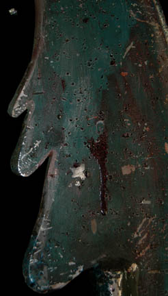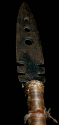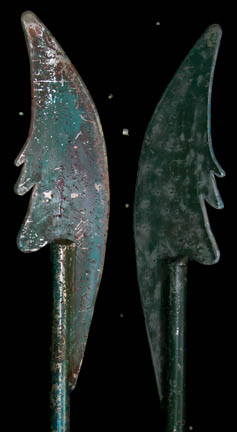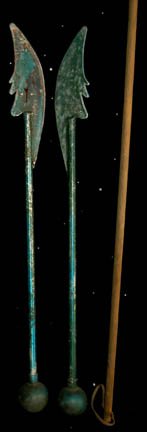 Description: A lot of prop weapons featured in various episodes of 24th century Star Trek episodic television, such as the Deep Space Nine episode “Battle Lines”. This lot consists of four pieces: a simple wooden staff with leather cord ties through a hole on one end and three pieces of metal bent into a hooked position; a sanded, varnished, wooden staff featuring weathered, leather cloth wrapped where the hand might go, a metal spearhead with holes in the middles and notches on the side tied into the end of the shaft with twine and more leather cloth below that. Also included are two blue-green, short, axes with angled blades, serrations on the other side, and spherical, weighted ends. All weapons are real metal but were used as props and all weapons are distressed for appearance. The spear measures approx. 73 X 2 circular inches, the axes approx. 45 X 5 inches and the hooked, metal weapon is approx. 75 X 10 inches.