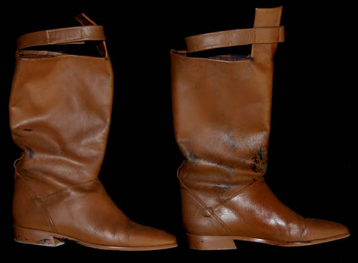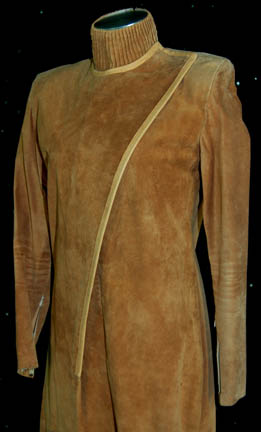 Description: A costume featured in the Star Trek; The Next Generation episode “The Outcast”; wherein “Commander Riker” (Jonathan Frakes) falls in love with a member of an androgynous race who considers identifying as one specific gender a perversion. This costume is for wear by Callan White in the role of the J'naii that reported on one of their own that she was identifying as a female, “Krite”, and is a long-sleeved, full-length, light-brown suede jumpsuit featuring tan piping, a wrap around front that attaches at the shoulder via Velcro and clasps, a matching dickie, and matching brown boots. A sewn in tag reads ‘Callan White’ and the costumer’s tag reads ‘#217 The Outcast, Krite, Callan White’.
