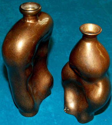 Description: A lot of set dressings featured in the second half of the two part Star Trek: Enterprise episode taking place in the mirror universe of the Terran Empire where “Commander Archer” (Scott Bakula) finds a Federation Starfleet ship more than a century more advanced than what his Starfleet has; these items come from the Captain's quarters of that ship. This lot includes a yellow teardrop-shaped sculpture with orange droplet designs, globular patterns that change with your perspective and a decorative hole in the middle sitting on a reddish-orange base featuring a black “veined” design. Two irregularly-shaped, corked, liquor bottles; one with a silver, glittery appliqué of alien script written on it; two copper colored, black-flecked jar sculptures that are made to resemble the general shapes and curves of a man and woman, an oval-shaped case of a metallic-copper shade with rows of textured knobs that opens to reveal gray foam featuring room for a phaser and other instruments. The last item is perhaps the best, and most amazing from an artistic and aesthetic aspect; a hand-blown, iridescent cobalt-blue vase/vessel of clear Asian influence that summons images of a wishing well someplace with its textured handle that resembles the “roof” of the well and, on the body of the vessel is an equally iridescent design that could either be an amazingly intricate motif of the wind blowing through the trees of a forest, or just abstract to the point that it seems so. The yellow, teardrop sculpture measures 24 X 4 X 27 inches, the purple bottles are 14 X 3 circular inches each, the male aspect sculpture is 3 X 5 X 11 inches and the female is 3 X 3.5 X 10 inches respectively; the copper case is 11.5 X 17 X 8 inches and the cobalt, iridescent vase is 15 X 4 inches. All measurements are approximate based on appearance.