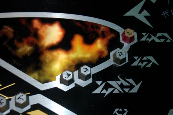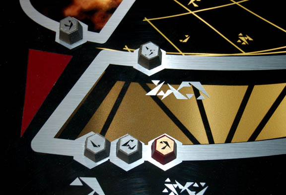 Description: The Son'a are a humanoid race descended from the Ba’ku who are known for their egotistical and materialist nature. They were featured prominently in Star Trek IX: Insurrection where they were fighting a loosing battle to overcome the affects of aging without access to the regenerative effects of the Ba’ku planet’s metaphasic radiation. This is a large smoked acrylic computer interface panel with a translucent application and silver and metallic red application accents made to section out the panel into differing modules, and other metallic silver applications used as ‘Son’a’ character letters on both the panel and the adhered raised plastic buttons featured in Star Trek IX: Insurrection. When back lit the item reveals a depiction of the ‘Briar Patch’, the region in which Star Trek IX: Insurrection takes place. Made to rest in a back lit console this item features a ‘lighted’ strip between two of the modules. Penned in on the upper right hand corner of the front is an arrow pointing up and ‘#1’ with removable markings. Item measures approx. 23.25 X 15.5 X 1.25 inches.