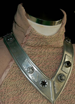 Description: “Yuta” (Lisa Wilcox) was the last surviving member of the Tralesta clan whose mission was to hunt down and kill the Lornak clan responsible for decimating her people in the Star Trek: The Next Generation episode “The Vengeance Factor”. Her costume includes a long taupe dress with flecks of pink and a central panel with piping. Around the neck is a metal collar with metal and resin accents and suede backing. A second collar is also included. Costume comes complete with costume tag.