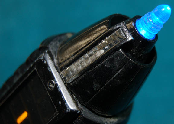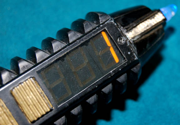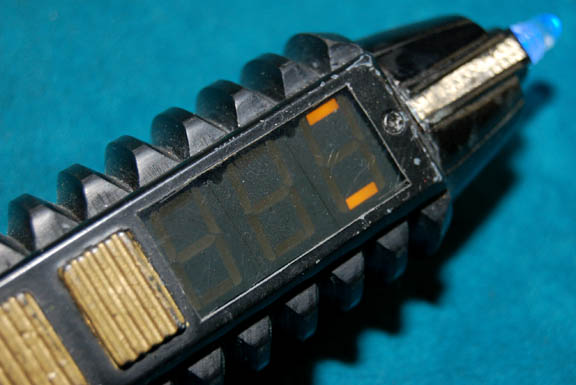 Description: An electronic prop engineering tool used on a Druoda Series 5 long range tactical armor unit by “B'Elanna Torres” (Roxann Dawson) in the Star Trek: Voyager episode “Warhead” in order to remove the artificial intelligence from the warhead. The tool is made of black resin and metal with gold colored applications and paint applied for detail. A small button on the side activates a pulsing blue LED light at the tip and scrolling LED lights on the side. Measures approx. 6 x 1 ½ inches diameter.
