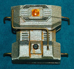 Description: A small cast resin “hero” prop featured in the Star Trek: Enterprise episode “Borderland” wherein members of the “Enterprise NX-01” crew like “T'Pol” (Jolene Blalock) are beamed onto ‘Orion’ starships and sold in a slave market. While in cages, the crewmembers are made to wear “neurolytic restraints” which cause them extreme agony if the impending slaves do anything out of line. This hero version of the prop is painted metallic silver with black painted details and metal wire accents on the face of the device as well as four side mounted ‘pins’ meant to appear as though they have punctured and grasped the skin of the wearer (the items appeared on the side of the neck of the characters in the episode). This particular item features an orange light that is activated by a black depressing button on the face of prop, powered by a single 3volt CR1225 sized battery (not included). The item measures approx. 1.5 X 1.75 X .75 inches.