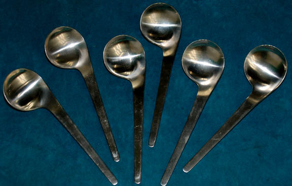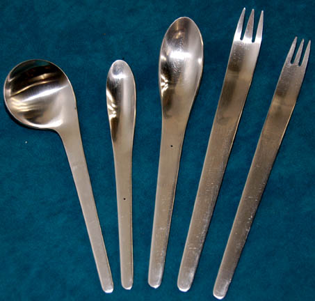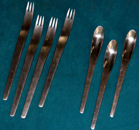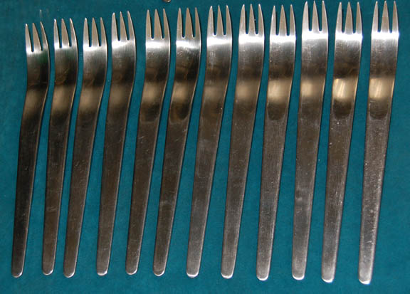 Description: An assortment of cutlery used as set dressing in the Star Trek: Voyager series in the mess hall and reused onboard the NX-01 in the Captain's mess hall during the Star Trek: Enterprise series. The lot includes twelve dinner forks, four salad forks, five tablespoons, three teaspoons and six soup spoons.