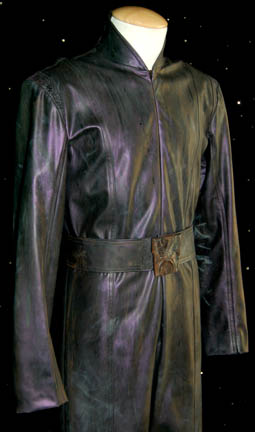 Description: The Vulcan Zombies were seen in the Star Trek: Enterprise episode, “Impulse” where Vulcans onboard their ship Seleya had lost control of their emotions due to Trellium-D poisoning. The costume is made of black vinyl with green, black and brown paint dripped over its entirety to give the impression of spilled liquids and disorder. It zips up the front and has removable black shoulder pads. It comes complete with a matching belt and a distinctly Vulcan resin buckle that attaches with Velcro. Costume comes complete with costume tag.