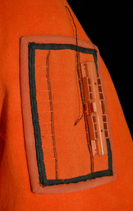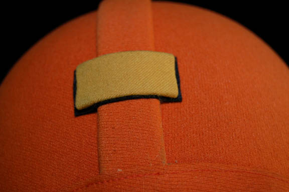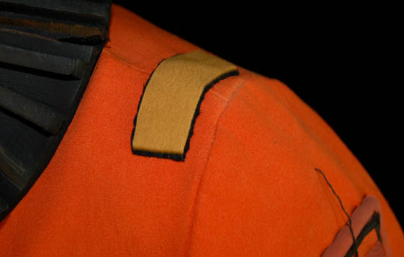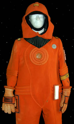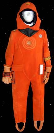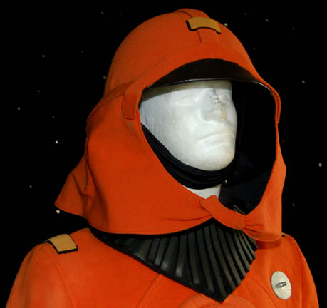 Description: A costume featured in Star Trek IV: The Voyage Home for wear by technicians in Starfleet Command who were monitoring the ecological damage being wrought outside. The costume is an orange radiological engineering suit like those appearing in other Star Trek feature films. The costume is an orange jumpsuit with affixed yellow division strips on the shoulders, a pair of ‘thermal' accents sewn onto the legs, one is missing its black tubing elements, a matching one on the left arm with no tubes, an affixed reflective element on the waist, an affixed orange trimmed yellow division strip on the left sleeve with an affixed silver colored metal commendation bar and a pair of ‘five year service’ pins, and an affixed orange placement with an affixed metal rank badge indicating the wearer to be an ‘able seaman’, and a metal breath mask attachment on the left breast. The costume also comes with these unattached elements: a matching cloth covered helmet, orange gloves with black ‘thermal’ tubing, a black foam collar, and a chest centered accent made from copper colored foil. The costume features costumer’s tags reading ‘window Crew (stunt) Starfleet Command, sc. 49-54’.