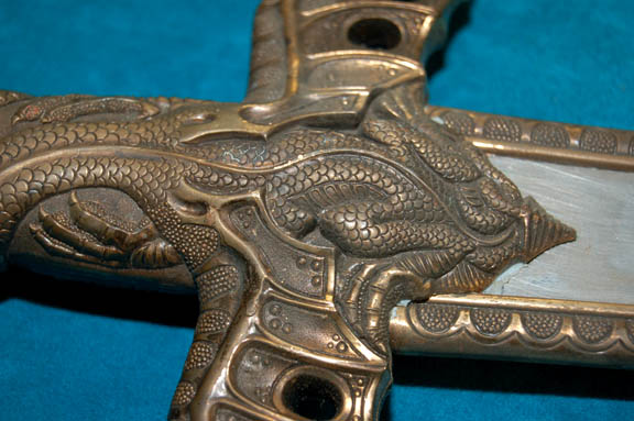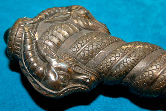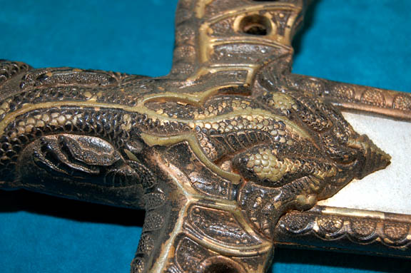 Description: A prop metal and a prop stunt sword featured variously in Star Trek episodic television. The items resemble double sided blades with a dragon or reptile motif for the guard, grip, and pommel. Both items feature green colored faux gems embedded in the pommel. The metal one is beveled to appear sharpened, the stunt sword is molded rubber painted to match its counterpart, and built around an internal metal frame. The items measure approx. 8 X 32 inches.